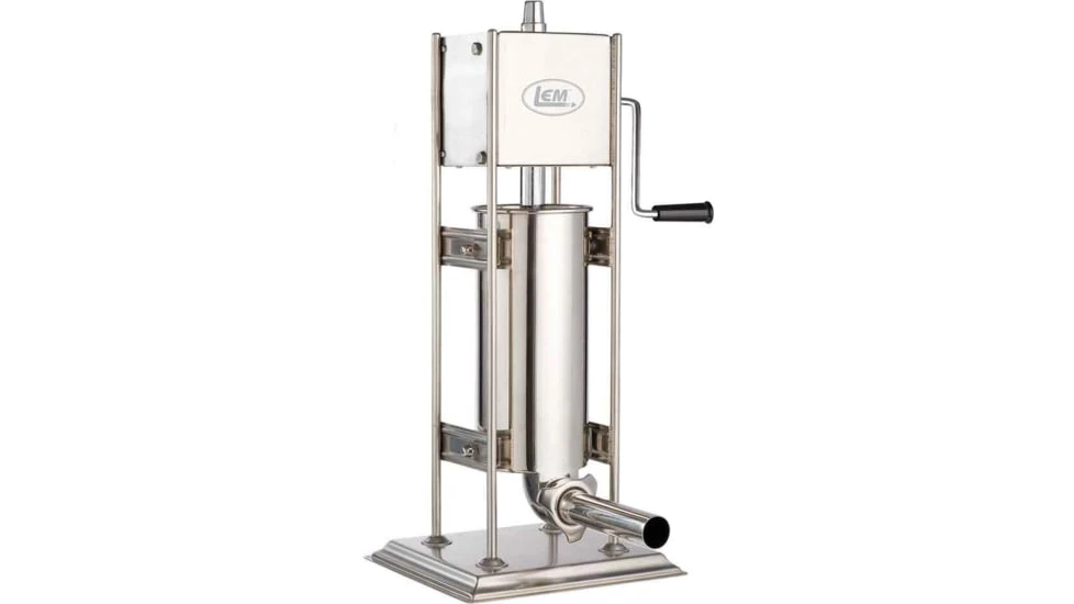 The 90 degree handle on the Big Bite Dual-Gear Stuffer gives you greater leverage and makes cranking easier than ever.Designed exclusively for LEM, these heavy-duty dual gear stuffers are the best you can buy. The huge drive gear, notched piston rod and all metal gears are built to deliver and withstand the pressure needed to stuff even small sausages. Four solid stainless steel bars create a sturdy frame that won’t bend or bow under pressure. The unique two-speed design allows a high speed to raise the piston quickly for filling the cylinder and the low speed for stuffing casings. An air release valve in the piston ensures even pressure and better results, and a heavy-duty rubber gasket seals the cylinder to prevent leaks. Stainless cylinder is removable for easy filling and cleaning. Mounting holes in base. Includes four stainless steel stuffing tubes (5/8in, 3/4in, 1in and 1-1/2in). A larger 25 lb. Stuffer (# 1111) also available for making everything from breakfast links to summer sausage.![]()