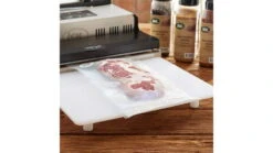 Use this work table in front of your vacuum sealer to hold the bag at sealing height. The solid plastic (PPE) table surface is food-safe and can double as a food prep surface if needed. The table is approximately 3/8in thick and holds up to 25 pounds. Dishwasher safe.![]()