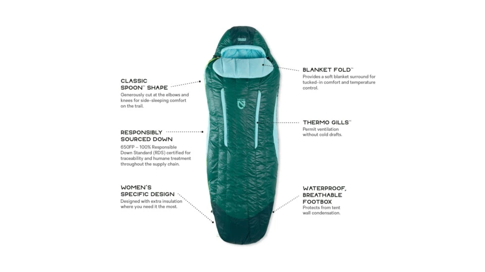 Classic Spoon shape adds room at elbows and knees for versatile comfort. Premium 650FP hydrophobic, PFC-free, 100% RDS Certified down is traceable and ensures humane treatment throughout the supply chain. Waterproof/breathable footbox protects from tent condensation, keeping feet warm and dry. Blanket Fold external draft collar and a full-length draft tube provide tucked-in comfort and temperature regulation. Thermo Gills allow you to vent body heat without letting cold drafts in. Full-length double-slider #5 YKK zipper with zipper plow makes getting in and out of the bag a breeze. Integrated pillow pocket allows a jacket, extra clothes, or Fillo to be stuffed into the sleeve opening for secure, elevated support through the night. Opposite-sided zippers on Disco Men’s and Women’s models increase versatility by allowing them to be zipped together into a double sleeping bag. Protected by the NEMO Lifetime Warranty. Patent # D804,780. Patents pending.![]()