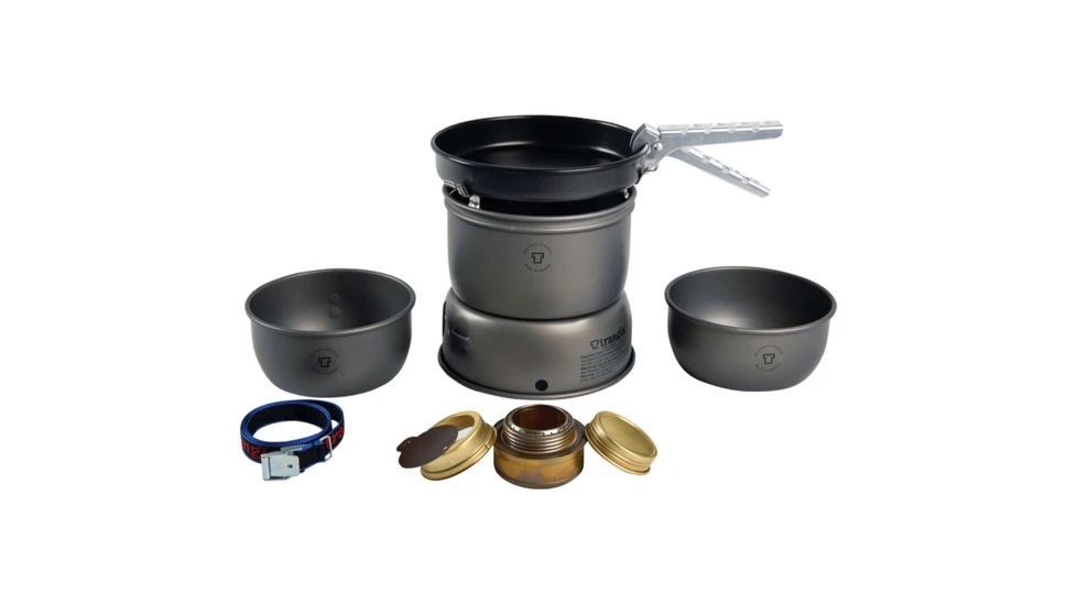 Stove with two 1 liter ultralight, hard anodized aluminum saucepans, one 7.25inch non-stick frying pan, and ultralight, hard anodized aluminum windscreens.![]()