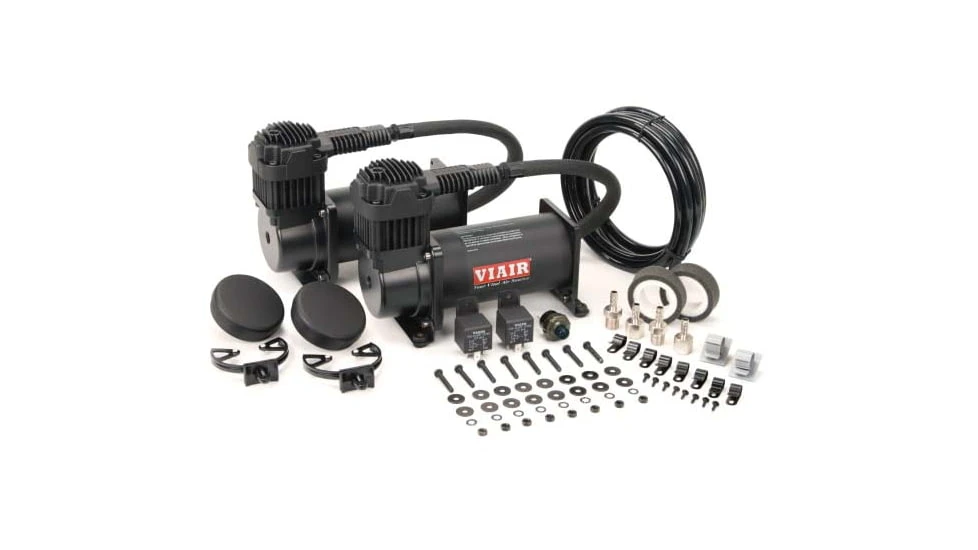 Dual 400C Value Pac, 150 PSI, 400C/2, 110/145 P. Switch, 40 Amp Relay/2. The VIAIR 400C Dual Performance Value Pack is our fastest filling, highest CFM air compressor system, This kit is perfect for industrial use, air horns, off-road applications, and a great addition to any air suspension kit. The 400C Dual Performance Value Pack includes two 12-volt Chrome or Stealth Black VIAIR 400C air compressors, two heavy duty 40-amp relays and an 110 PSI cut-on, 145 PSI cut-off pressure switch. Each Dual Performance Value Pack comes with remote mount filter assemblies and mounting hardware.![]()
